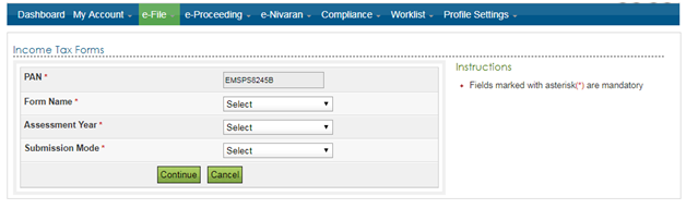 4. After successful log-in, click on E-File and select Income Tax Form, wherein following screen would be displayed. Mention Form Name as for Individuals being a resident other than not ordinarily resident having Income from Salaries, one house property, other sources (Interest etc.) and having total income upto Rs.50 lakh. Then select the Assessment Year and click on prepare and submit online under the heading Submission Mode.